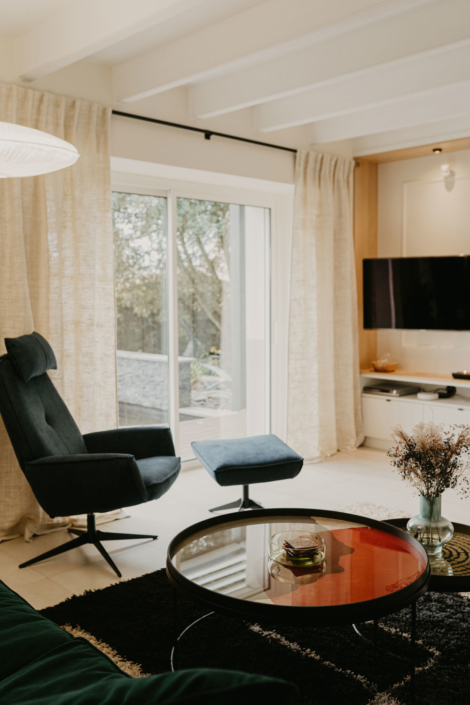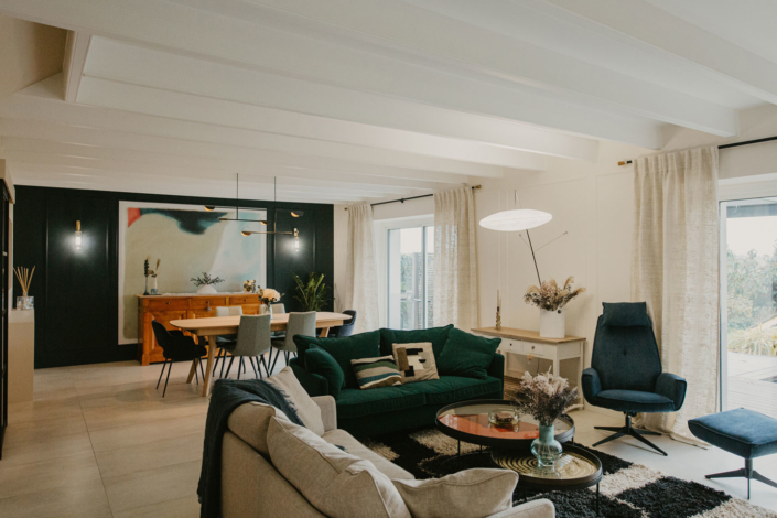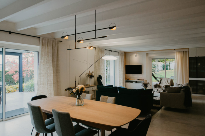 A la fois contemporain et chaleureux, le salon et ses nombreuses places assises lui permettent d’accueillir bon nombre d’invités en toute convivialité.
