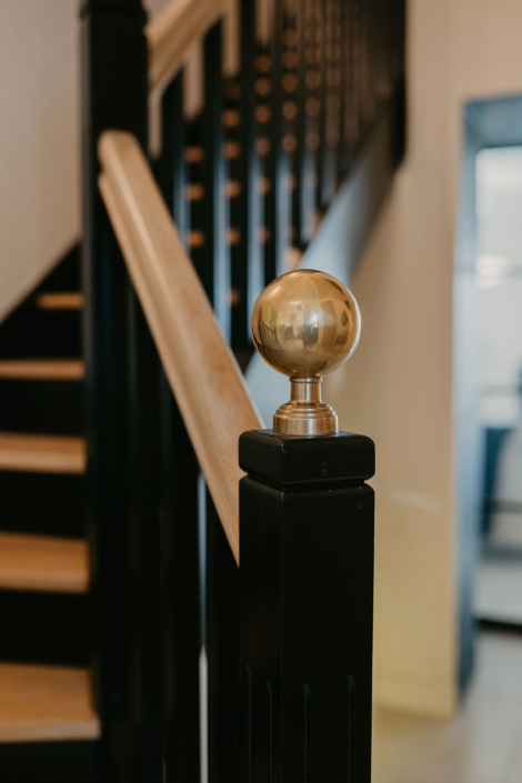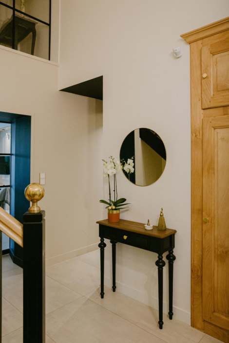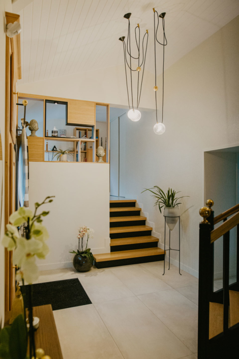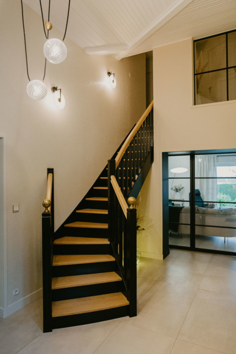 Une fois la porte passée, l’entrée et l’élégant escalier noir et bois donnent le ton !