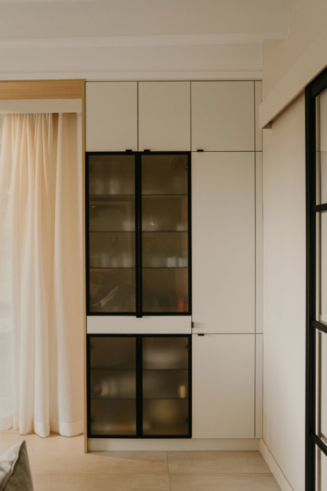 L’agencement conçu sur mesure apporte une grande quantité de rangement tout en se fondant totalement dans l’espace.