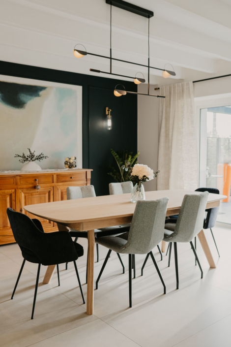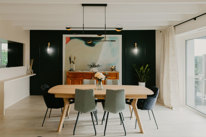 Le buffet et l’ensemble table/chaises s’accordent parfaitement avec les teintes douces et le motif vaporeux de ce tableau en arrière-plan.