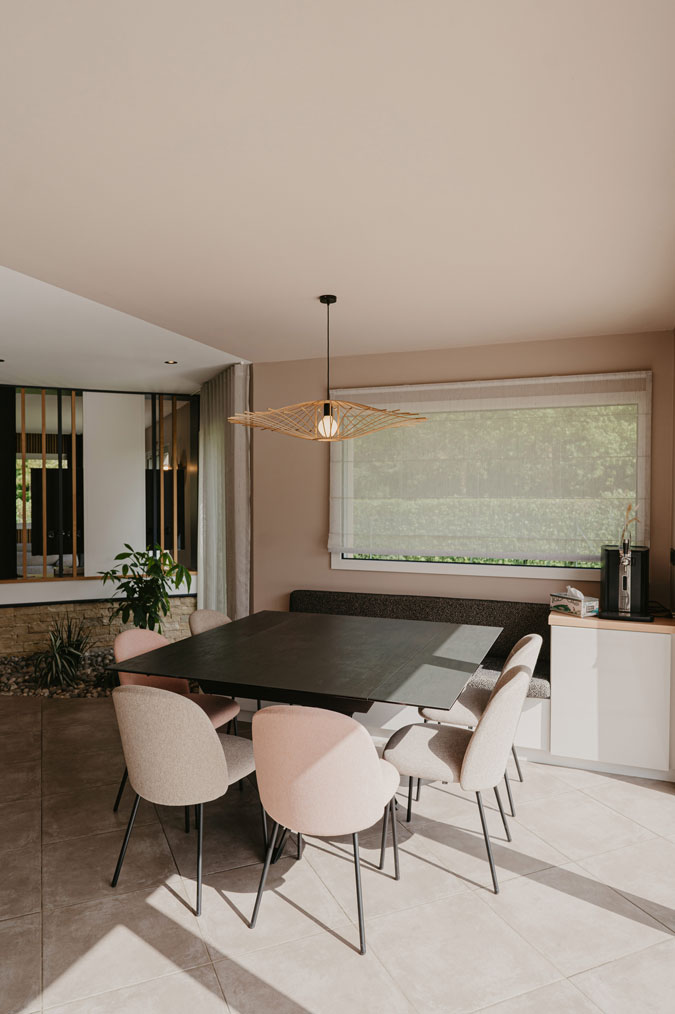 La salle à manger a été judicieusement déplacée pour tirer pleinement parti de la lumière naturelle, créant une atmosphère chaleureuse et accueillante. La douce teinte “Pin Douglas” encadre délicatement cette zone, tout en mettant en valeur la verdure extérieure.