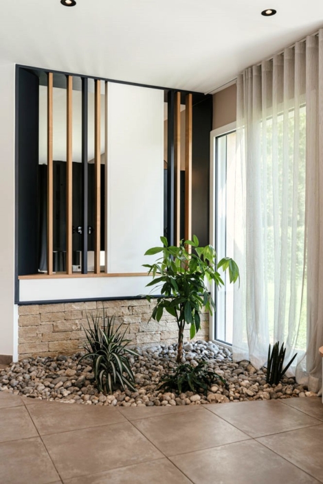 Un claustra a été intégré pour isoler visuellement le salon du reste de l’espace de vie. Ce design intelligent permet d’incorporer harmonieusement la télévision et les appareils hi-fi, assurant ainsi une intégration parfaite dans le style global de la décoration.
